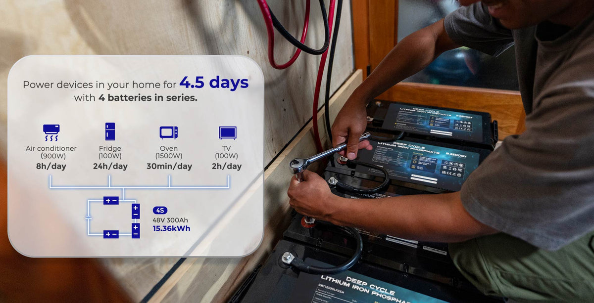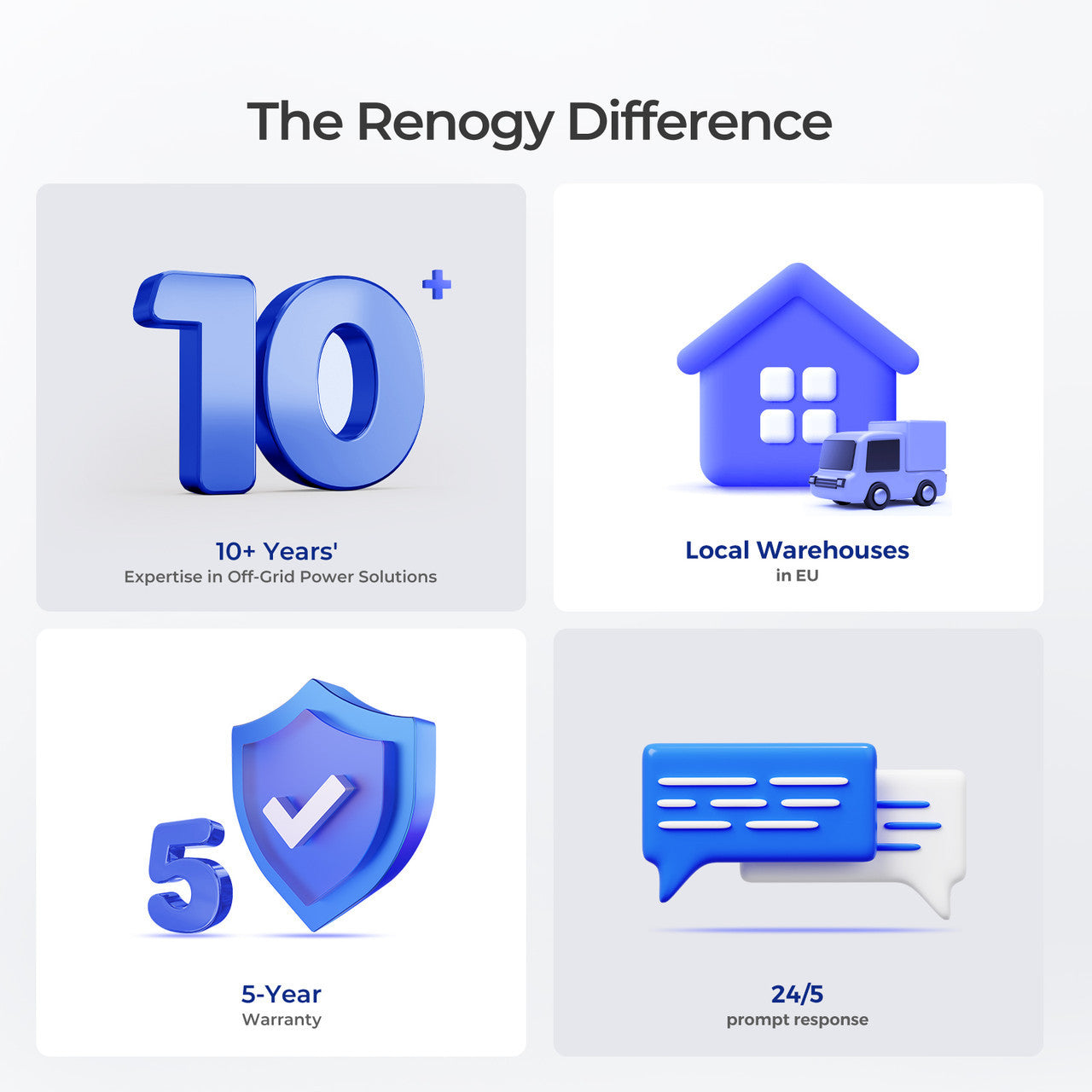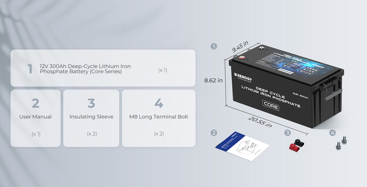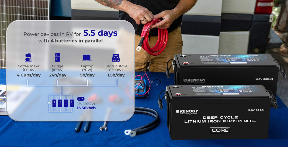 Tanto si eres un aventurero de fin de semana como un nómada a tiempo completo, las baterías Renogy Core LiFePO₄ 300Ah te ofrecen acceso fácil a la energía en la carretera. Conecta hasta 4 baterías en paralelo para alimentar los electrodomésticos esenciales de tu caravana hasta 5,5 días, disfrutando de varios días de energía fuera de la red con mayor comodidad.