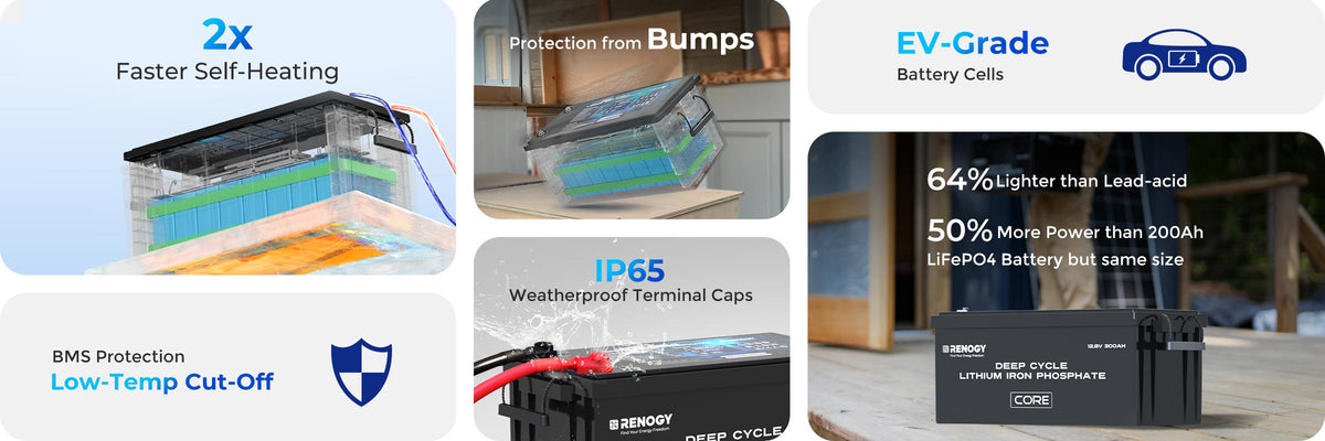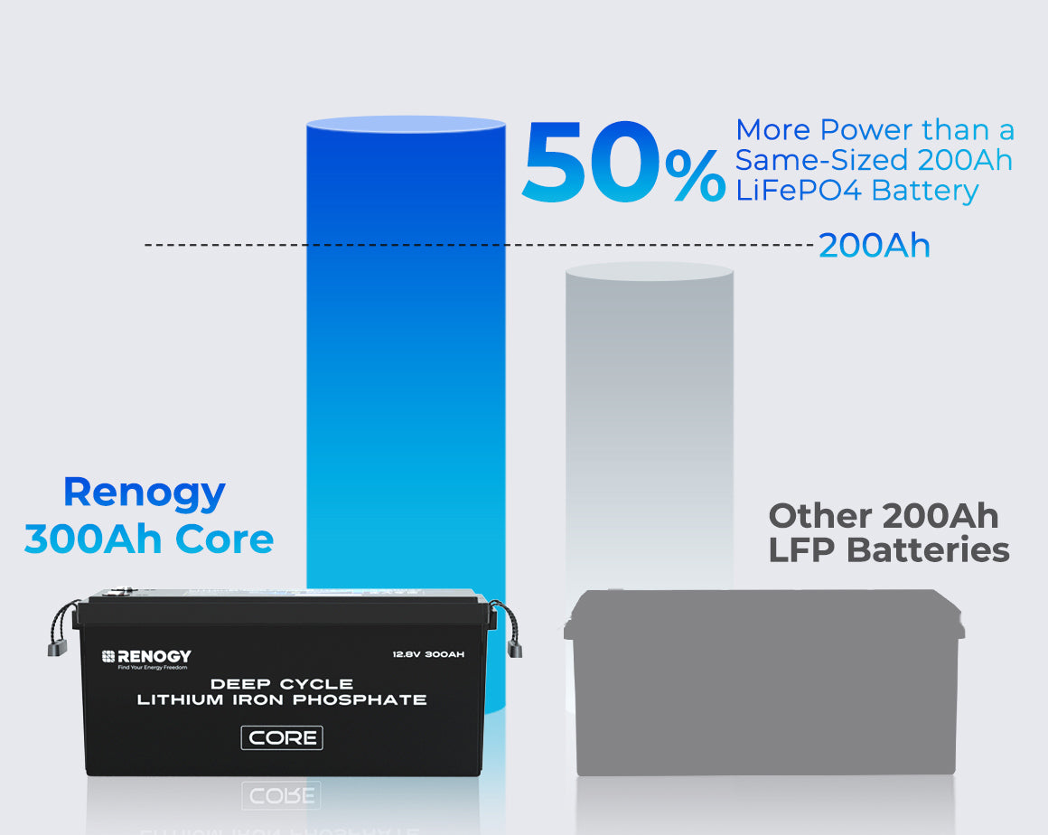 La Renogy Core 12V 300Ah ofrece un 50 % más de potencia que una batería LiFePO₄ de 200 Ah del mismo tamaño. Disfruta de la capacidad extra que necesitas para afrontar tormentas, huracanes, incendios forestales y otros imprevistos, estés donde estés.
