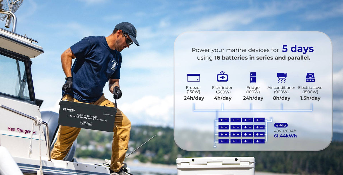 Estás a un paso de convertir tu barco de pesca en un espacio de confort moderno. Las baterías Renogy Core 12V 300Ah pueden conectarse en configuración 4P4S —16 baterías en serie y paralelo— para alimentar los dispositivos de a bordo hasta durante 5 días, garantizando energía estable y sin interrupciones en cada travesía.