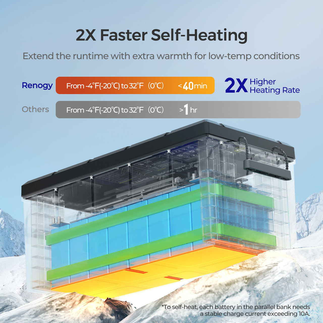 Con los elementos calefactores más potentes del sector (200 W), la batería LiFePO₄ 12 V 300 Ah se calienta el doble de rápido que otras baterías con función de calefacción. Asegúrate de mantener una corriente de carga estable superior a 10 A por batería para activar correctamente la función de autocalentamiento.