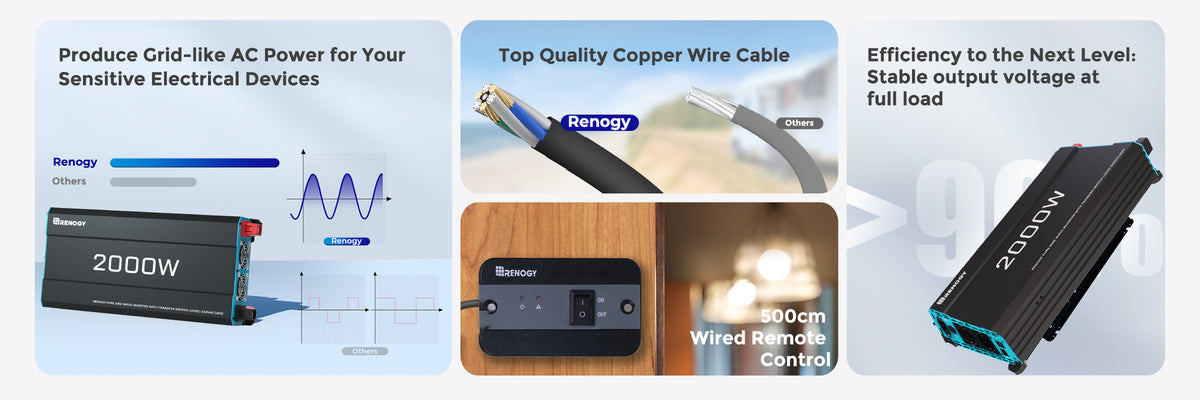 - 【Instalación fácil y sin complicaciones】 Incluye un cable de 20 mm² (4 AWG) y un control remoto para una instalación rápida y sencilla. El inversor Renogy facilita la configuración, ofreciendo energía limpia y fiable para autocaravanas y sistemas solares fuera de la red.