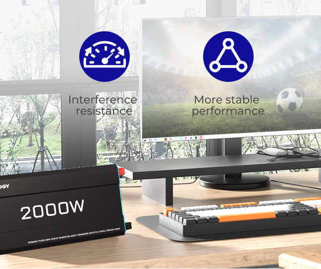 La salida de onda sinusoidal pura proporciona un suministro de energía suave y estable, muy similar a la electricidad de la red, lo que la hace extremadamente versátil y compatible con una amplia gama de dispositivos eléctricos. Los inversores Renogy funcionan a la perfección incluso con equipos sensibles, evitando problemas de compatibilidad o interferencias, ayudando a prolongar la vida útil de los dispositivos y garantizando un rendimiento fiable.