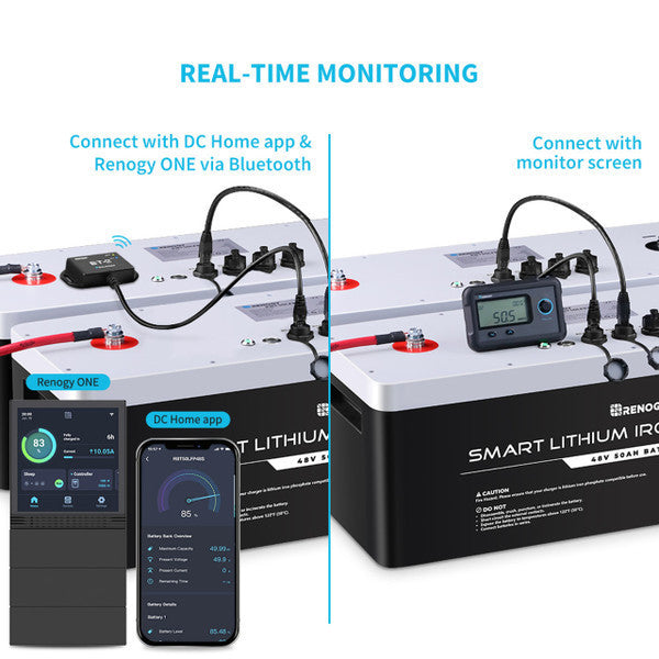 - Plug in a Renogy BT-2 Bluetooth Module and pair it with Renogy ONE M1 to keep track of real-time information about your batteries and stay updated via the DC Home app when you are away. You can also check on the charging status at a glance through a Renogy monitoring screen.