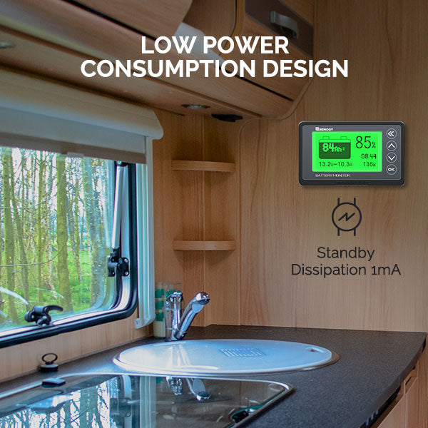 Este monitor proporciona detección de corriente de alta precisión y un indicador exacto del estado de carga de la batería. También puedes configurar una alarma para voltaje alto o bajo. Cuando la alarma se activa, la retroiluminación y el valor de voltaje parpadearán en la pantalla, alertándote sobre qué hacer cuando se alcance el voltaje de desconexión.