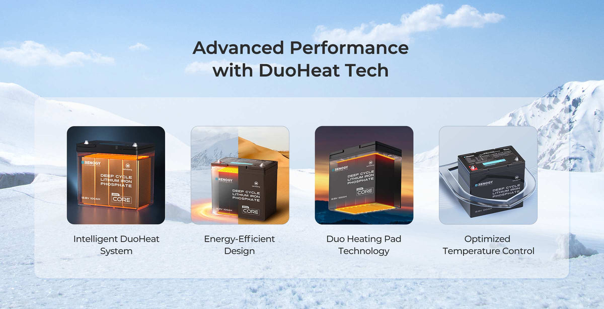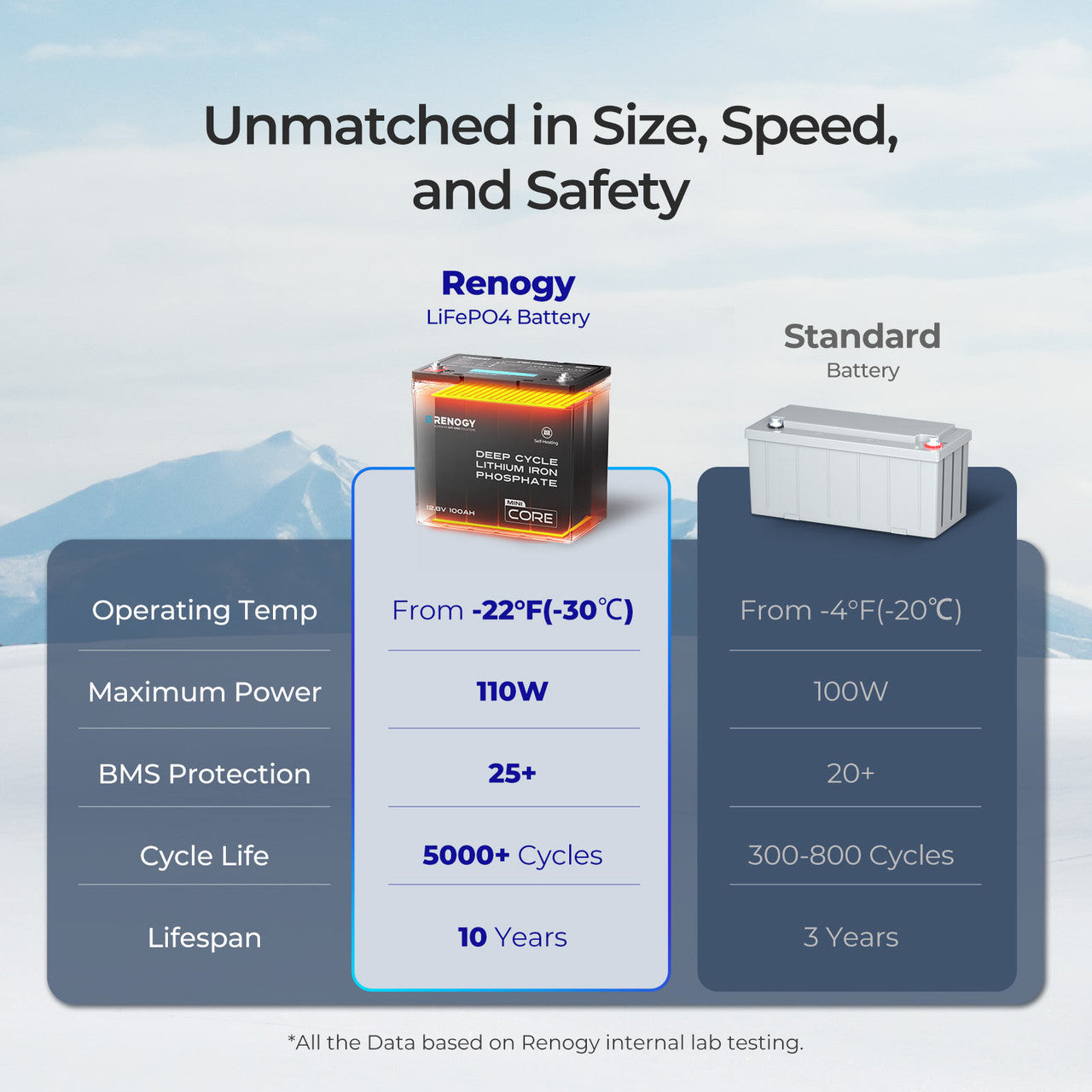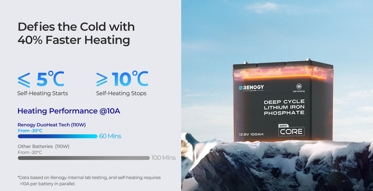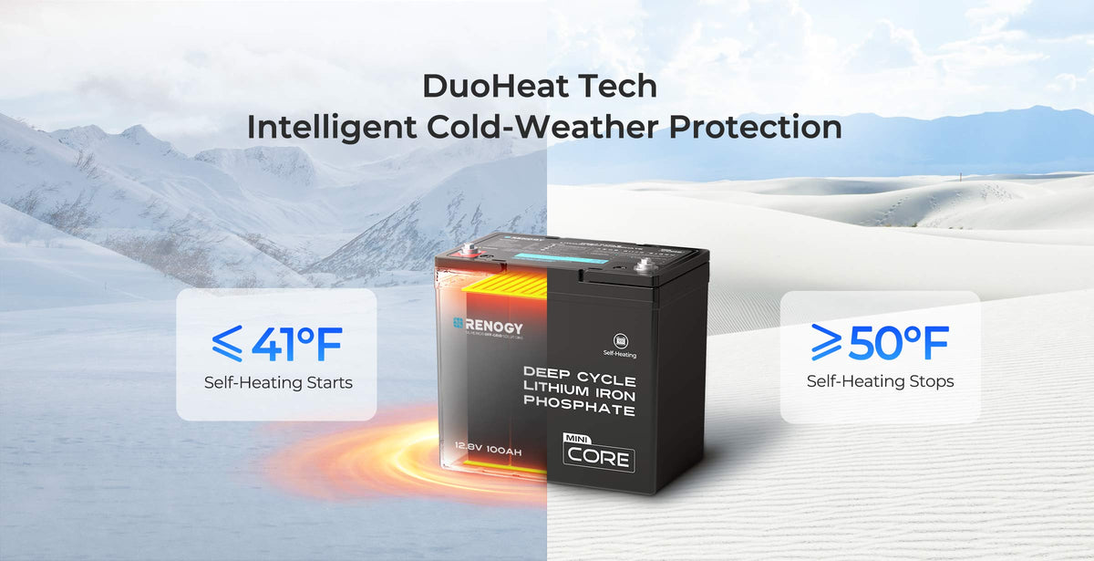 La batería LiFePO4 Renogy 12V 100Ah con tecnología DuoHeat ofrece 110 W de potencia de doble calefacción, brindando el doble de eficiencia que los diseños convencionales. Disfruta de un calentamiento un 40 % más rápido y una tolerancia de temperatura un 13 % mayor, alcanzando el estado listo para cargar desde tan solo -30 °C (-22 °F) en solo 60 minutos. No dejes que el clima frío detenga tu aventura.