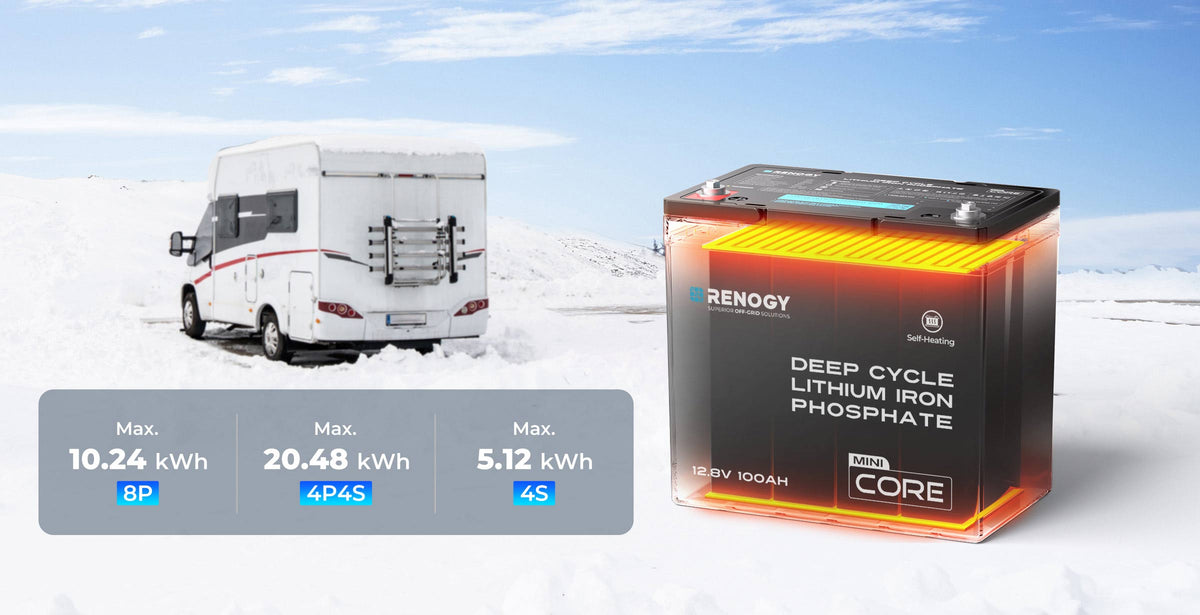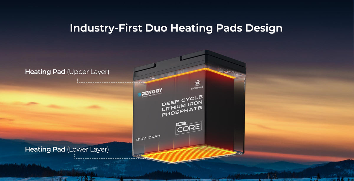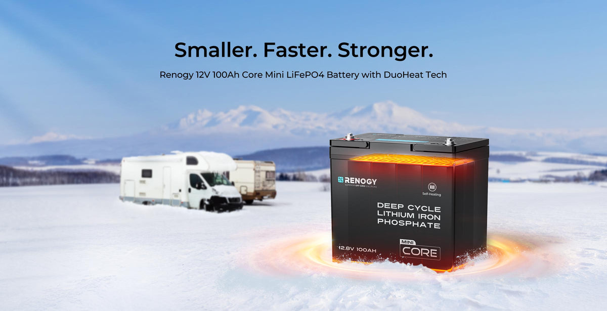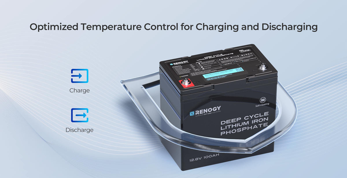 La batería LiFePO4 Renogy 12V 100Ah con tecnología DuoHeat ofrece 110 W de potencia de doble calefacción, brindando el doble de eficiencia que los diseños convencionales. Disfruta de un calentamiento un 40 % más rápido y una tolerancia de temperatura un 13 % mayor, alcanzando el estado listo para cargar desde tan solo -30 °C (-22 °F) en solo 60 minutos. No dejes que el clima frío detenga tu aventura.