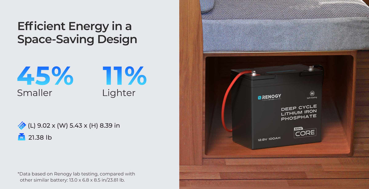 Disfruta de un rendimiento excepcional en un paquete un 45 % más pequeño. La batería LiFePO4 Renogy 12V 100Ah Core Series ofrece gran potencia en un diseño ligero, con un 11 % menos de peso que las baterías estándar. Obtén más espacio para tus aventuras y más energía para tu viaje.