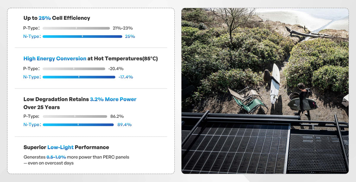 • 25 % de eficiencia gracias a células N-Type para mayor potencia y durabilidad