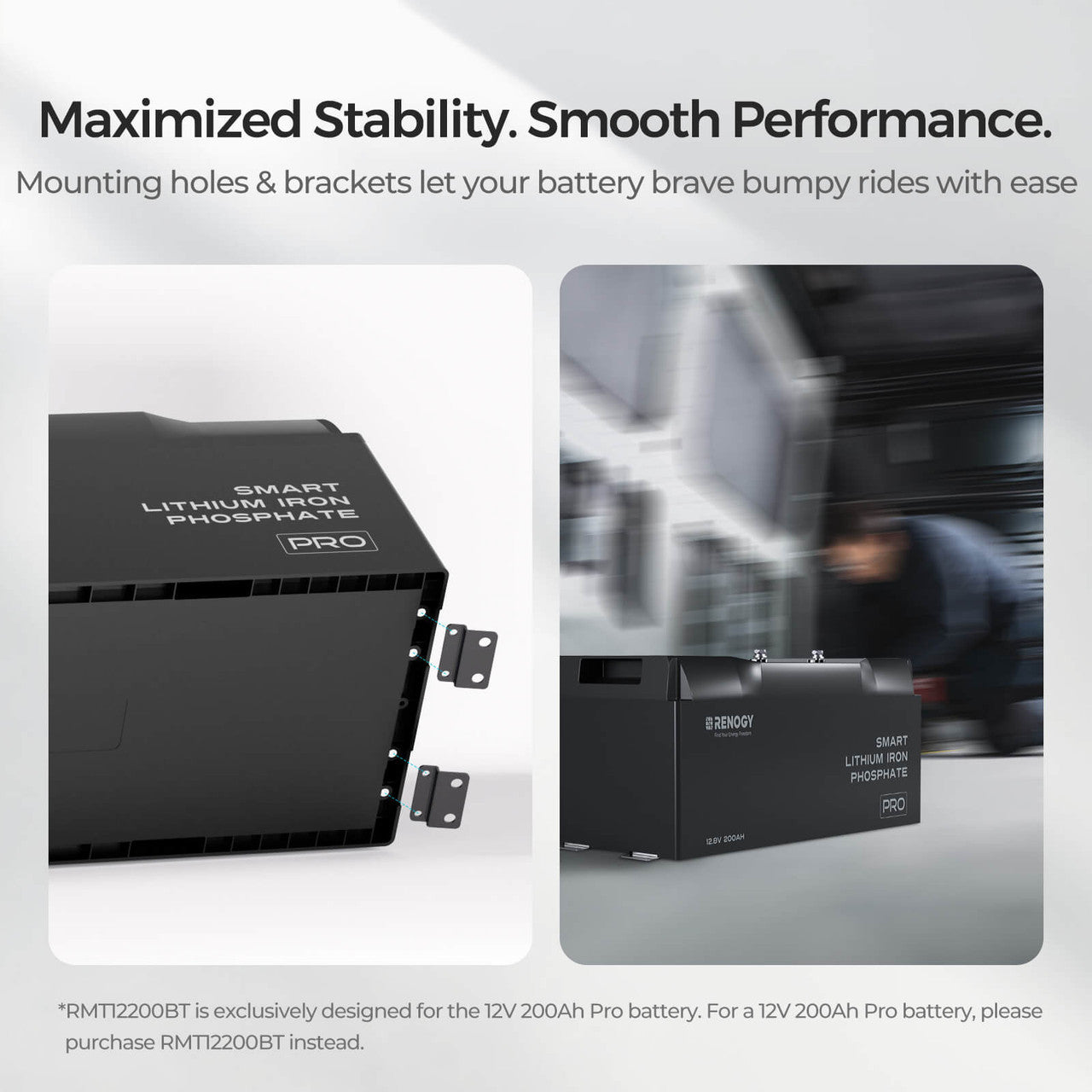Made exclusively for Renogy 12V 200Ah Pro LiFePO4 Batteries, this mounting bracket pack is a great addition to your batteries, ensuring that your batteries stay firmly in place, whether you are driving in rugged terrain or navigating through choppy waves. The pack includes everything you need for a simplified installation to save time and effort in sizing/DIY.