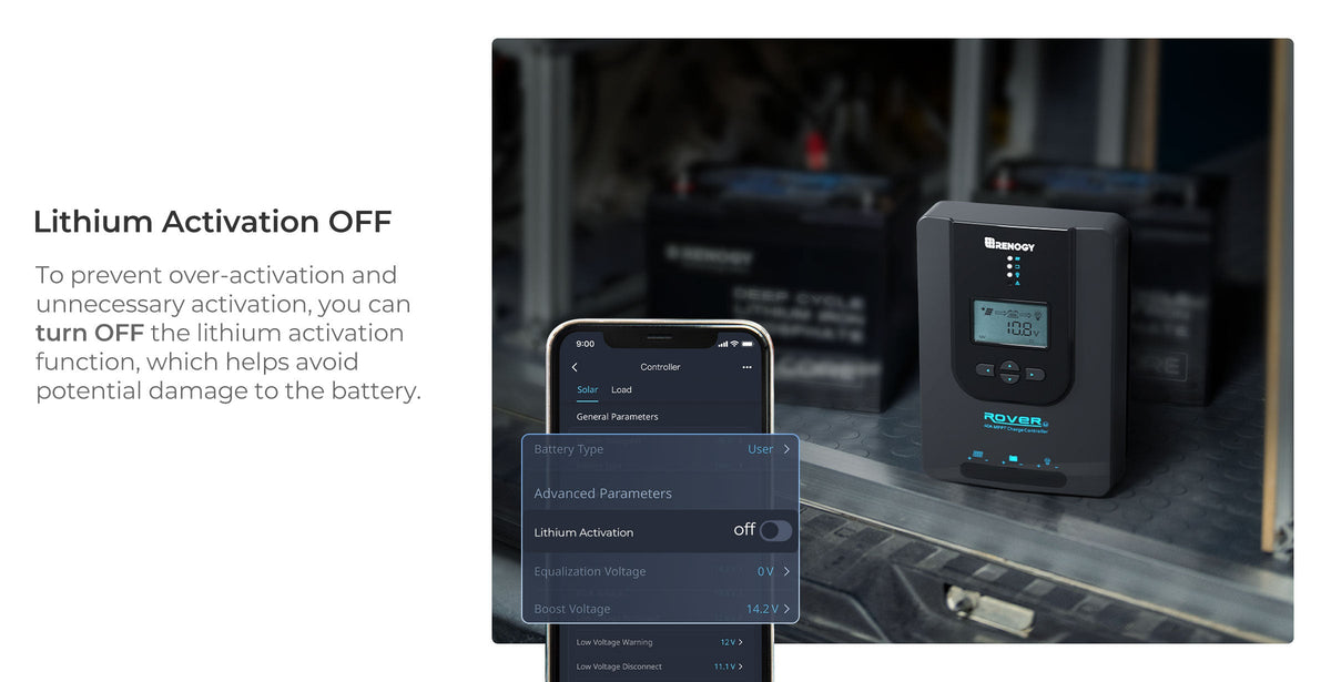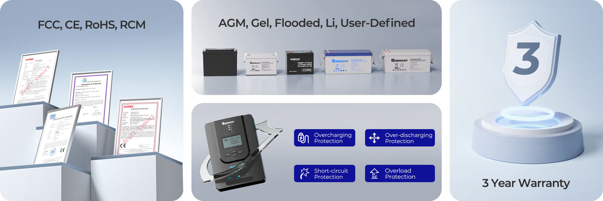 Renogy Rover Series solar charge controllers use Power Catcher MPPT algorithm to always ensure the charge controller converts most energy by locking to the most optimal maximum power point.