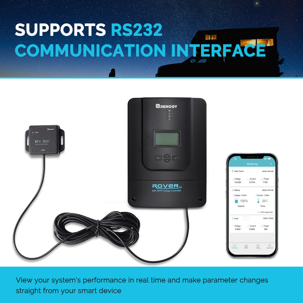 - Integrated with an RS232 port and RS485 port, Renogy 60A Rover MPPT Charge Controller can work with a BT-1 or a BT-2 Bluetooth module to deliver real-time energy data across the DC Home smart phone app